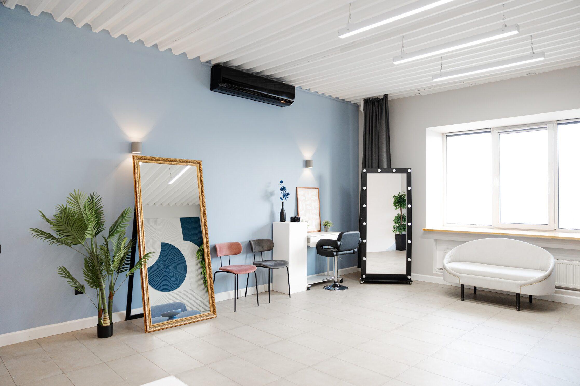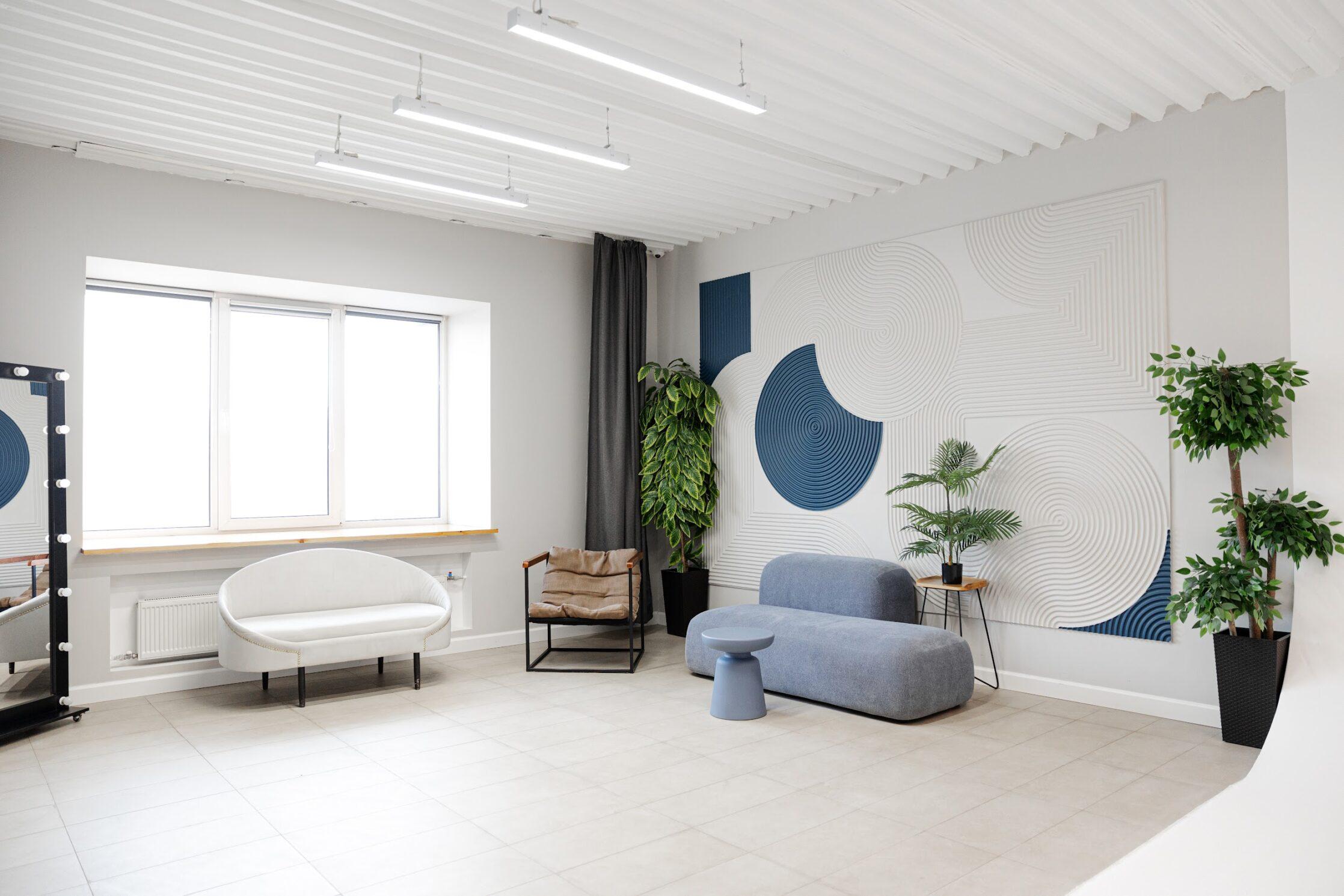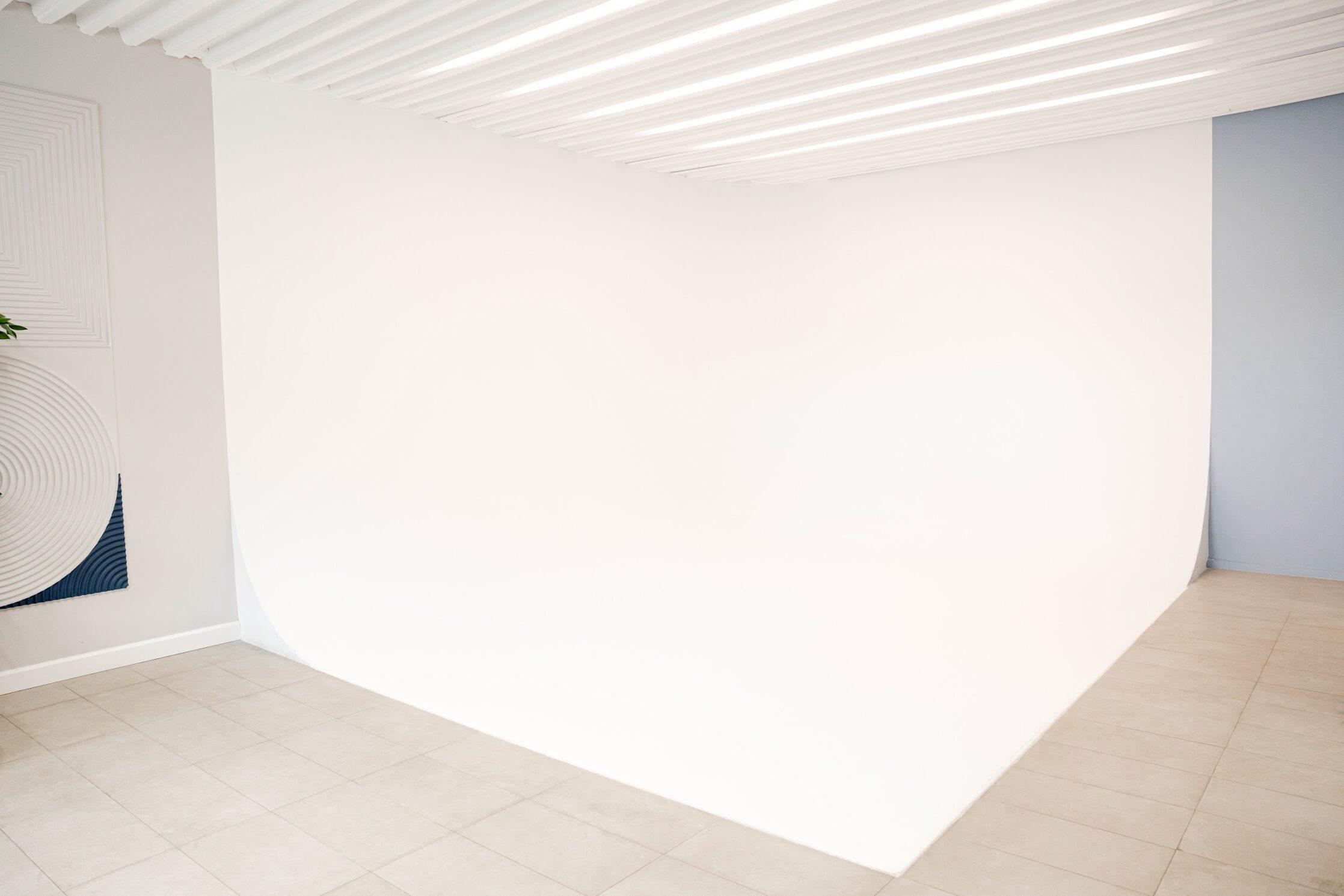 Большой светлый зал с угловой циклорамой высотой 3.20 и размером 4х5 метров и просторной рабочей зоной. Вы можете арендовать студию для съемки на два часа и больше в Москве. В зале предусмотрен гримерный пост, багетное зеркало, диван и другая мебель. Фактурная стена служит в качестве дополнительного декоративного элемента интерьера. В зале высокие потолки, а общая площадь составляет 57 квадратных метров.