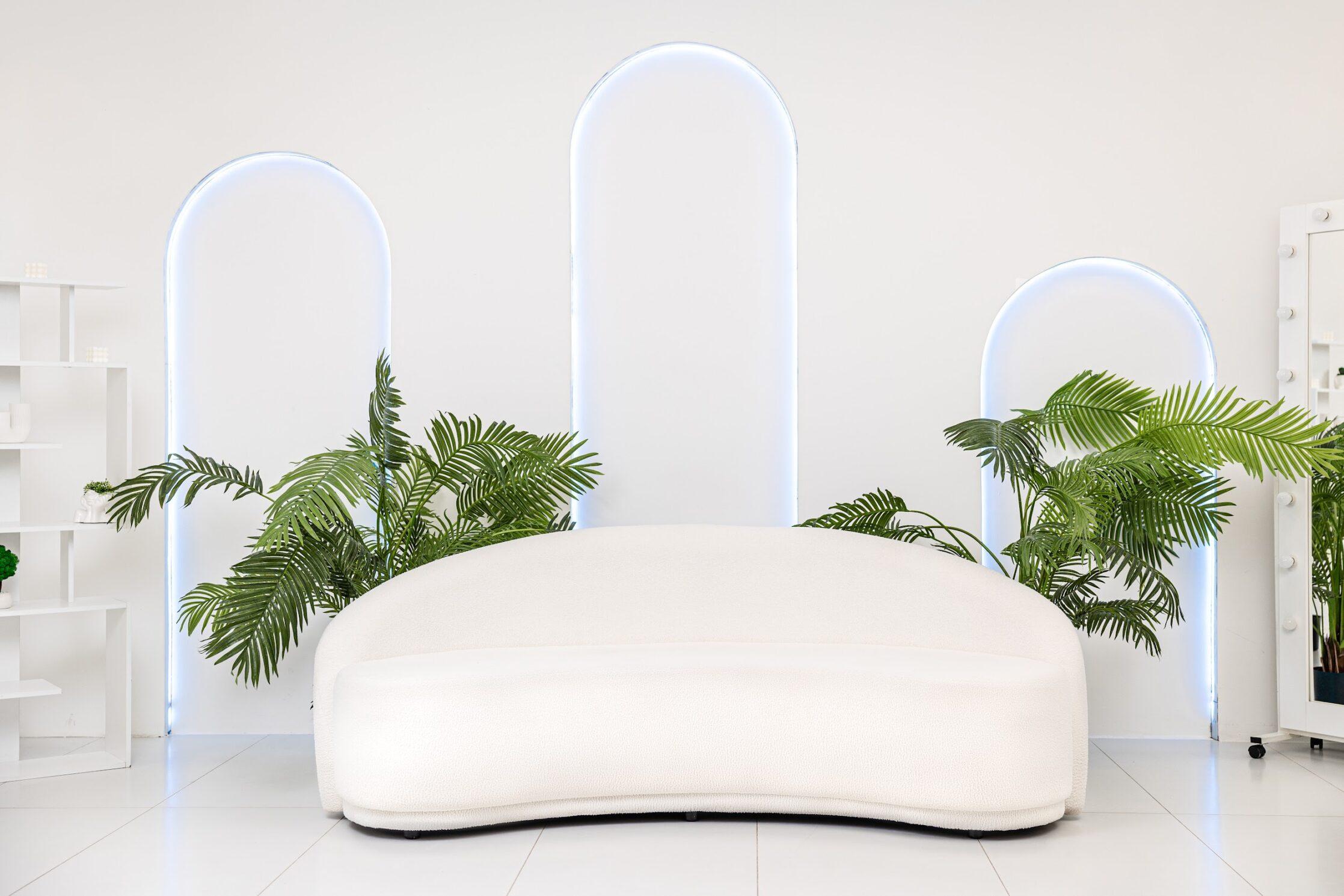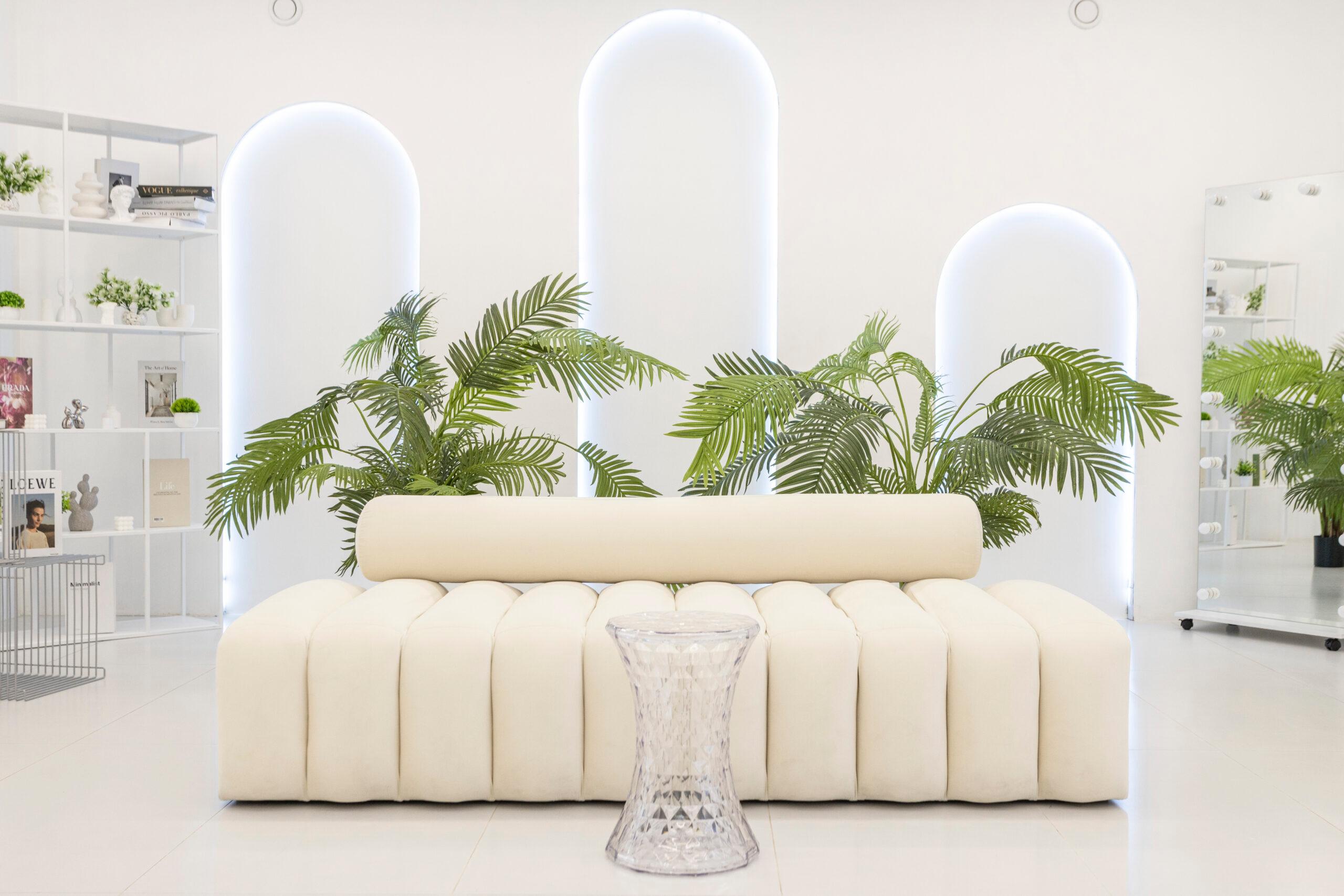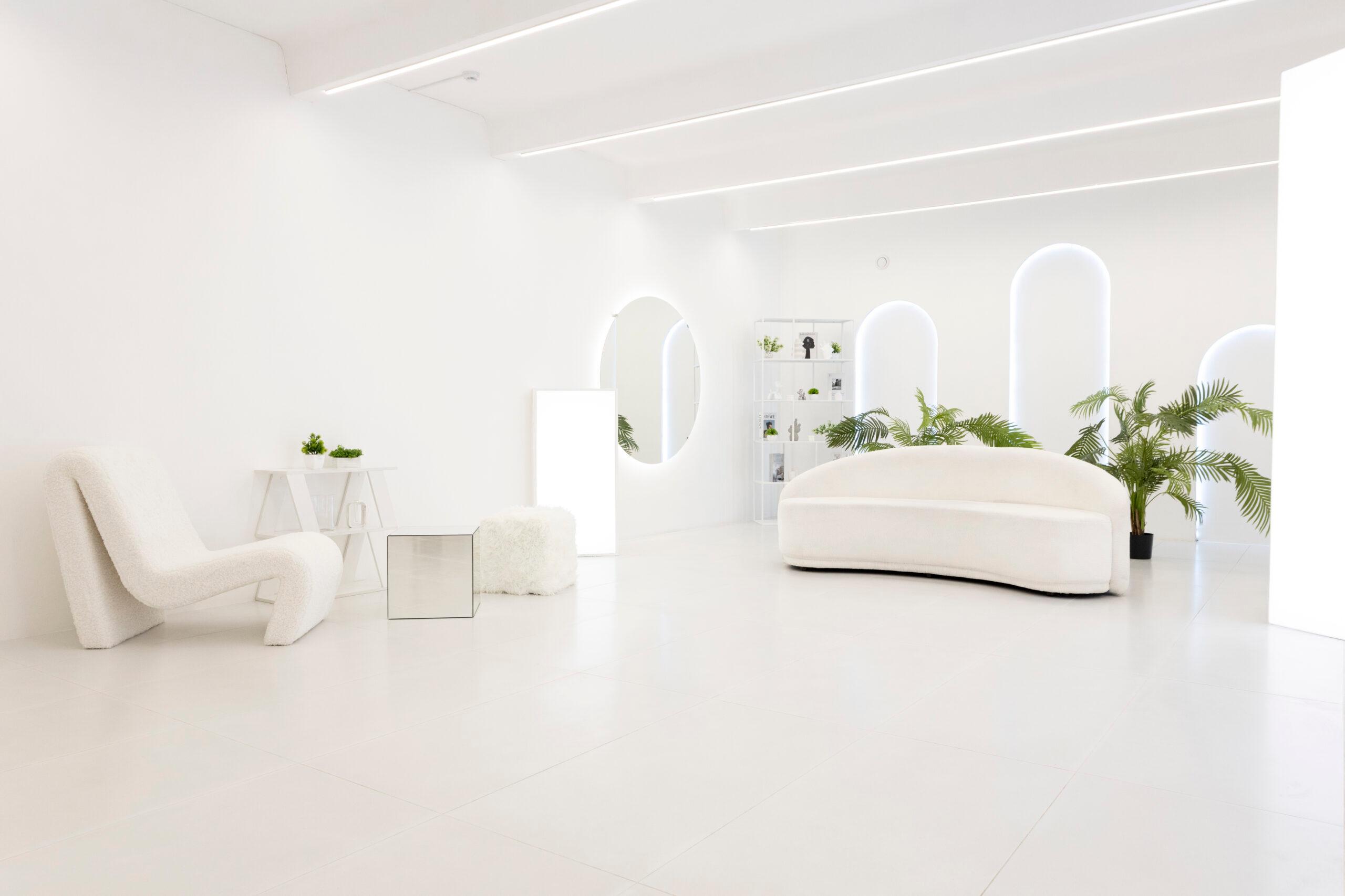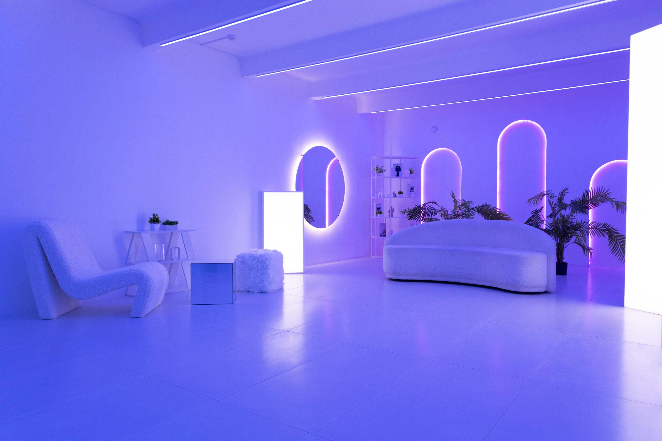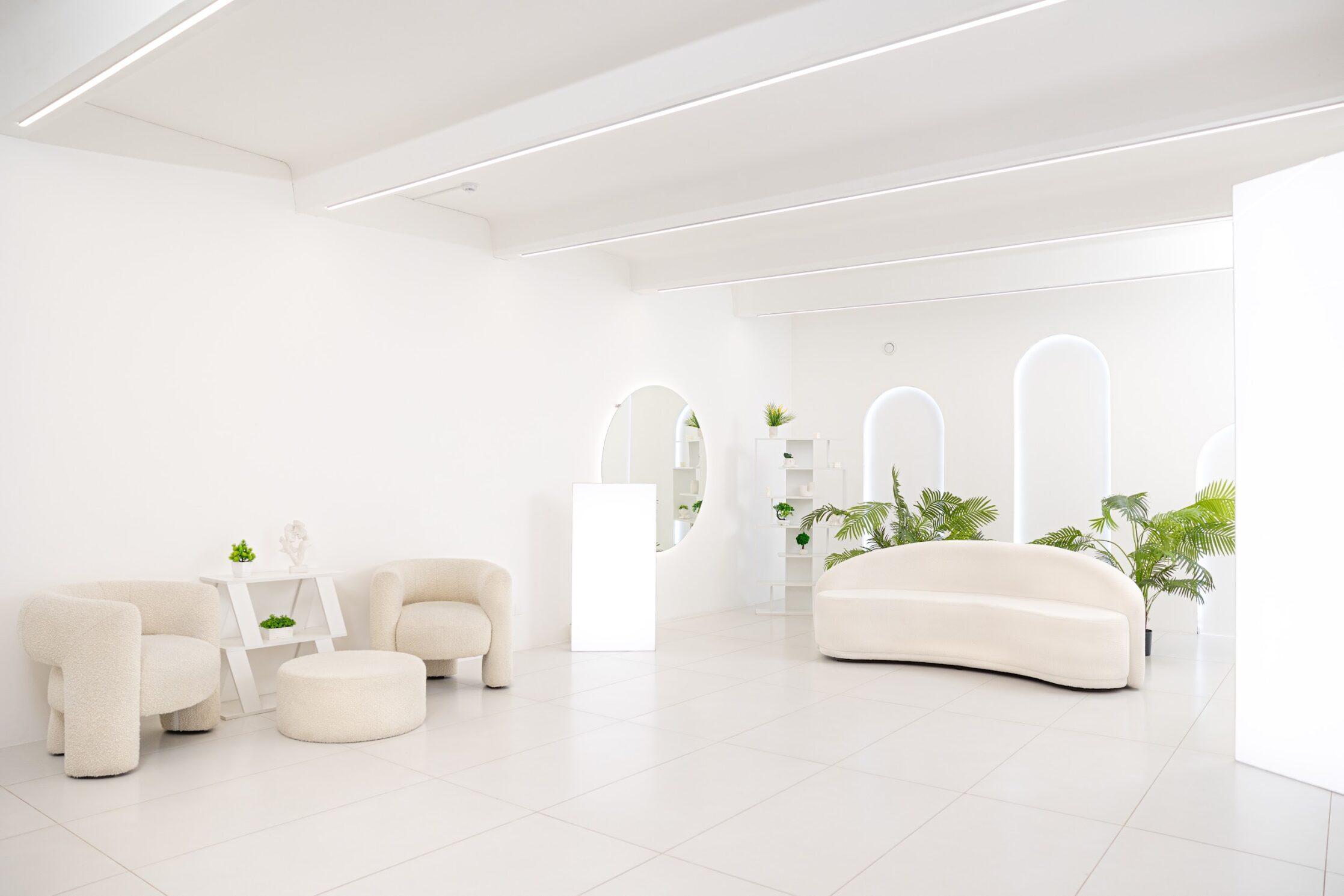 Белый зал с уникальным интерьерным решением. Встроенное светодиодное освещение позволяет изменить цветовую гамму по RGBW – каналам – CRI 91 и заполнить зал любым оттенком. В зоне с белой плиткой находится большой стеклянный стол, искусственные растения и неоновая вывеска с текстом MINIMALIZM. В основной части зала расположены белоснежный диван, стена с диммируемой подсветкой, а также пластиковые панели с подсветкой, и зеркало с внутренней светодиодной подсветкой.