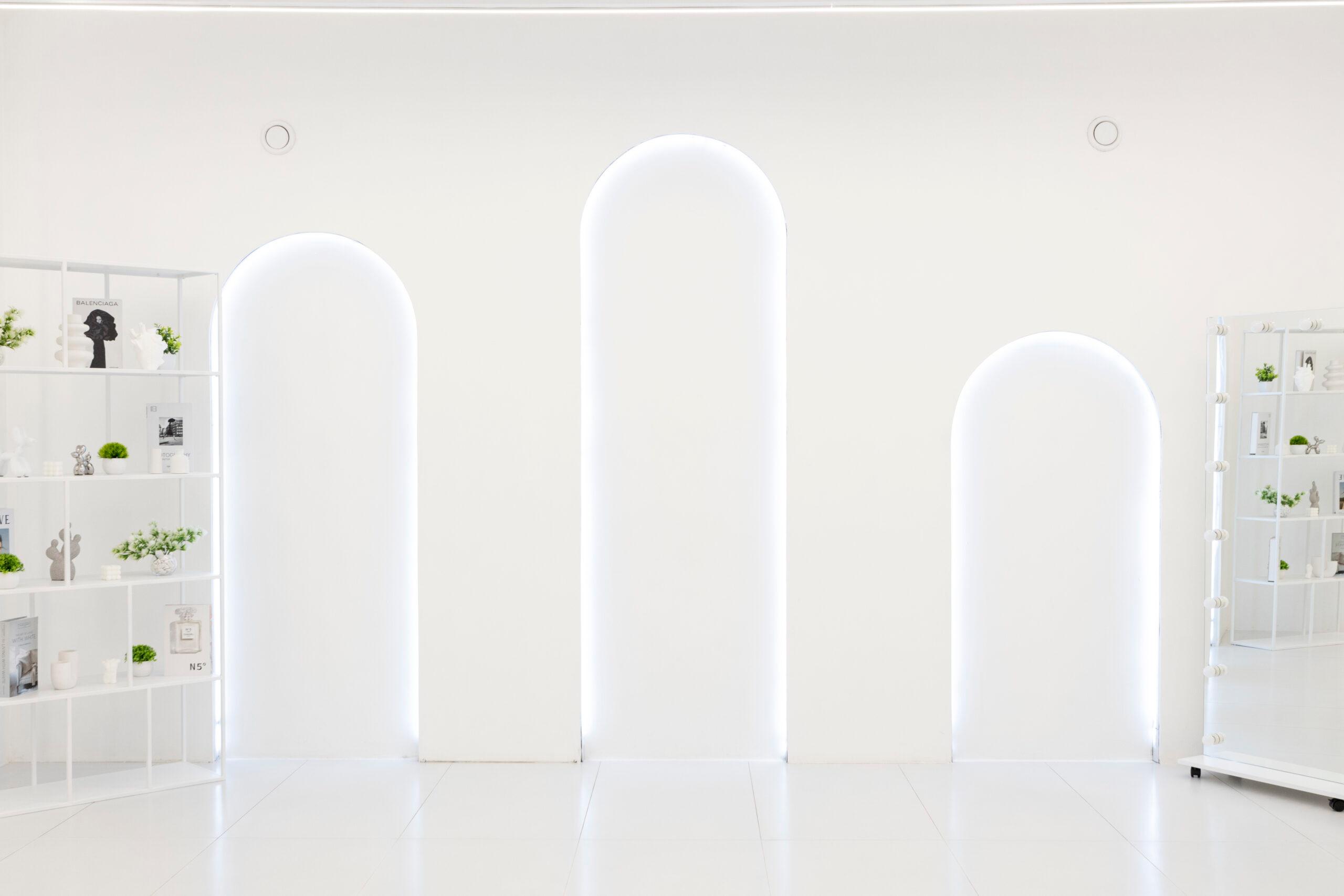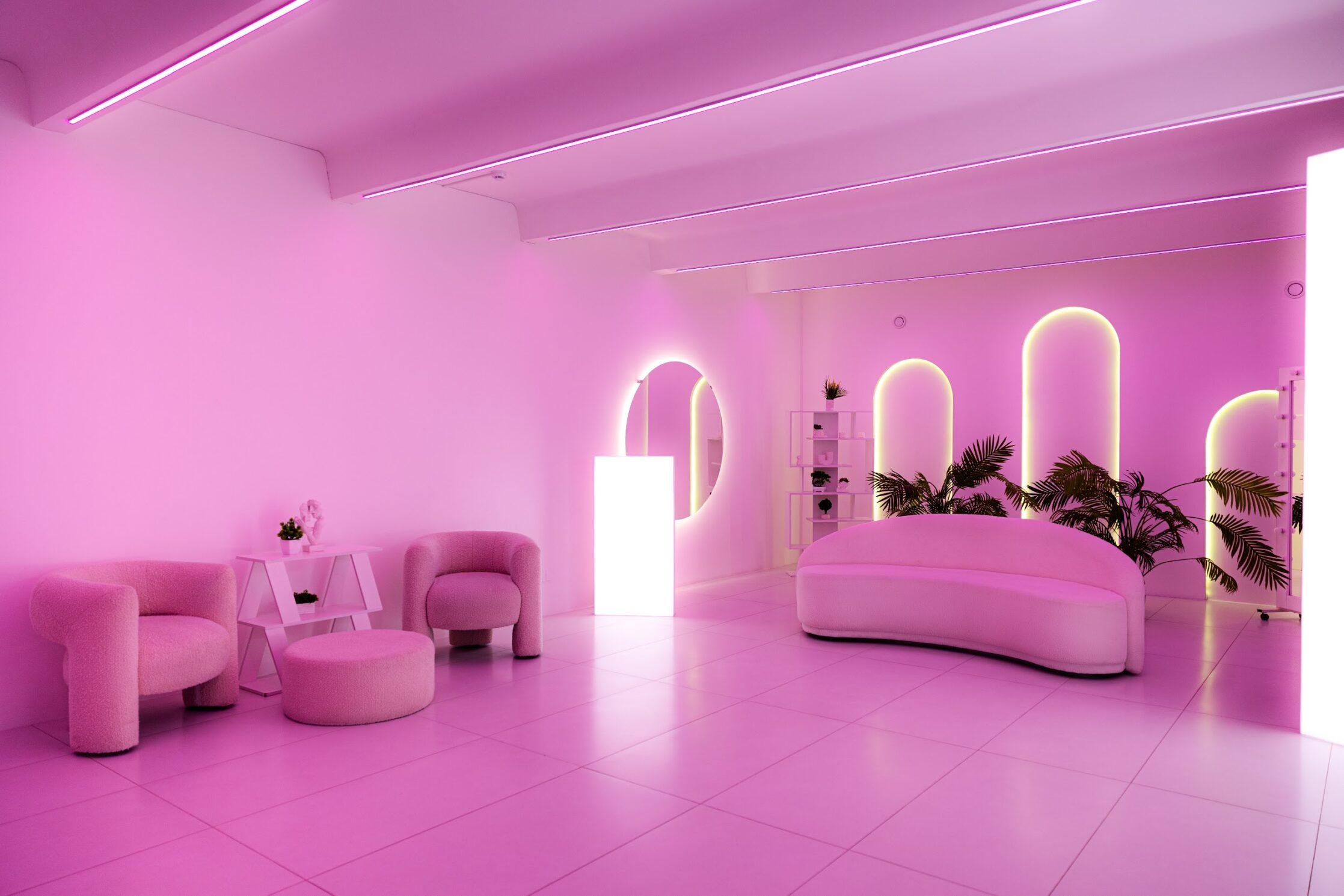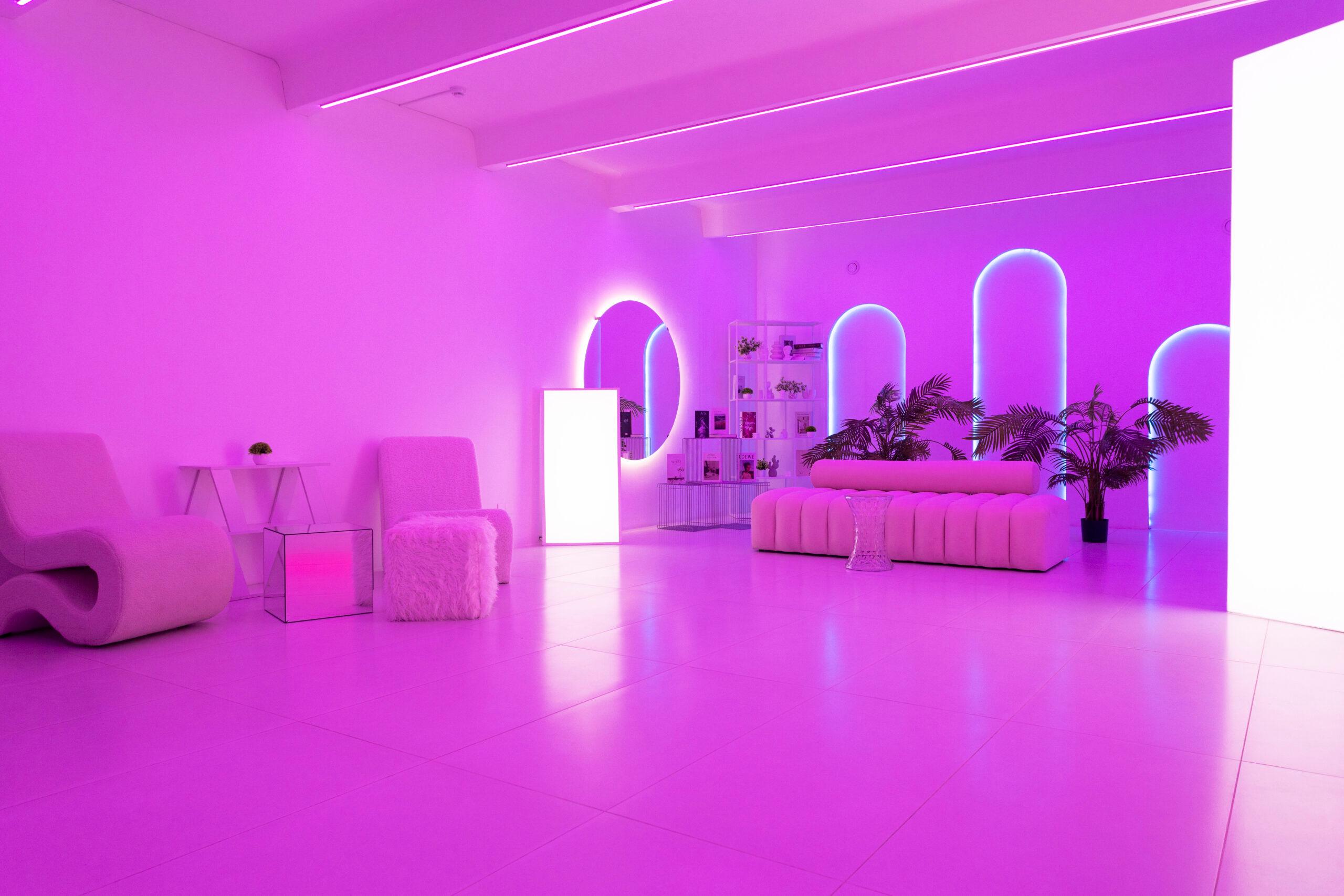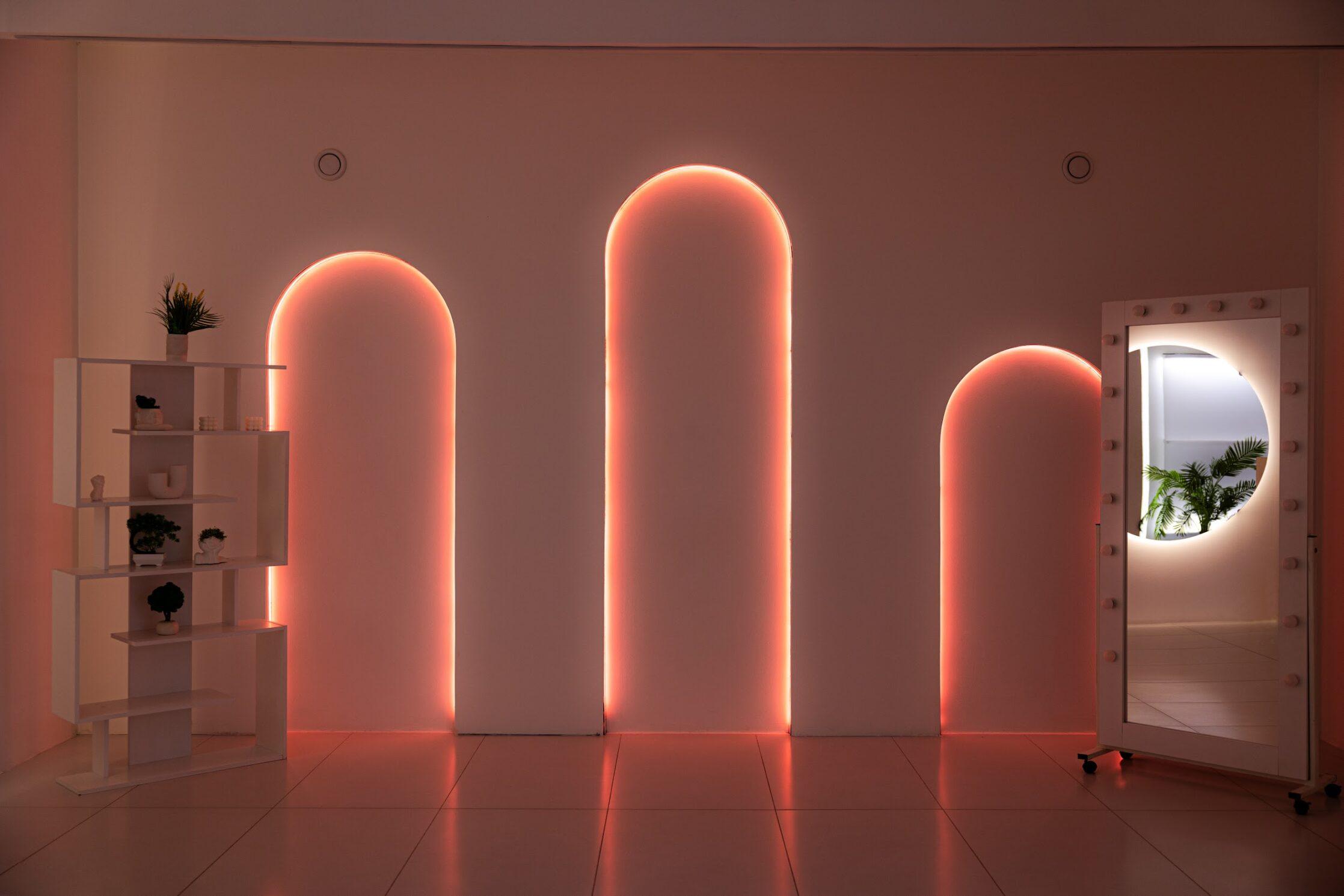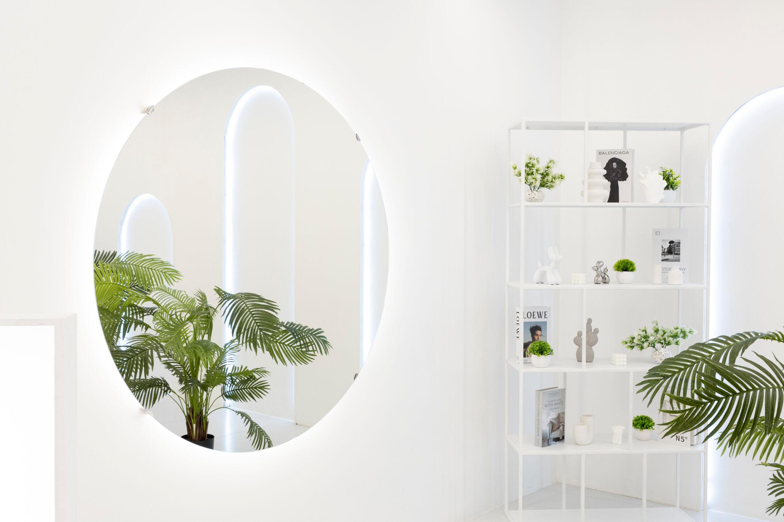 Белый зал с уникальным интерьерным решением. Встроенное светодиодное освещение позволяет изменить цветовую гамму по RGBW – каналам – CRI 91 и заполнить зал любым оттенком. В зоне с белой плиткой находится большой стеклянный стол, искусственные растения и неоновая вывеска с текстом MINIMALIZM. В основной части зала расположены белоснежный диван, стена с диммируемой подсветкой, а также пластиковые панели с подсветкой, и зеркало с внутренней светодиодной подсветкой.