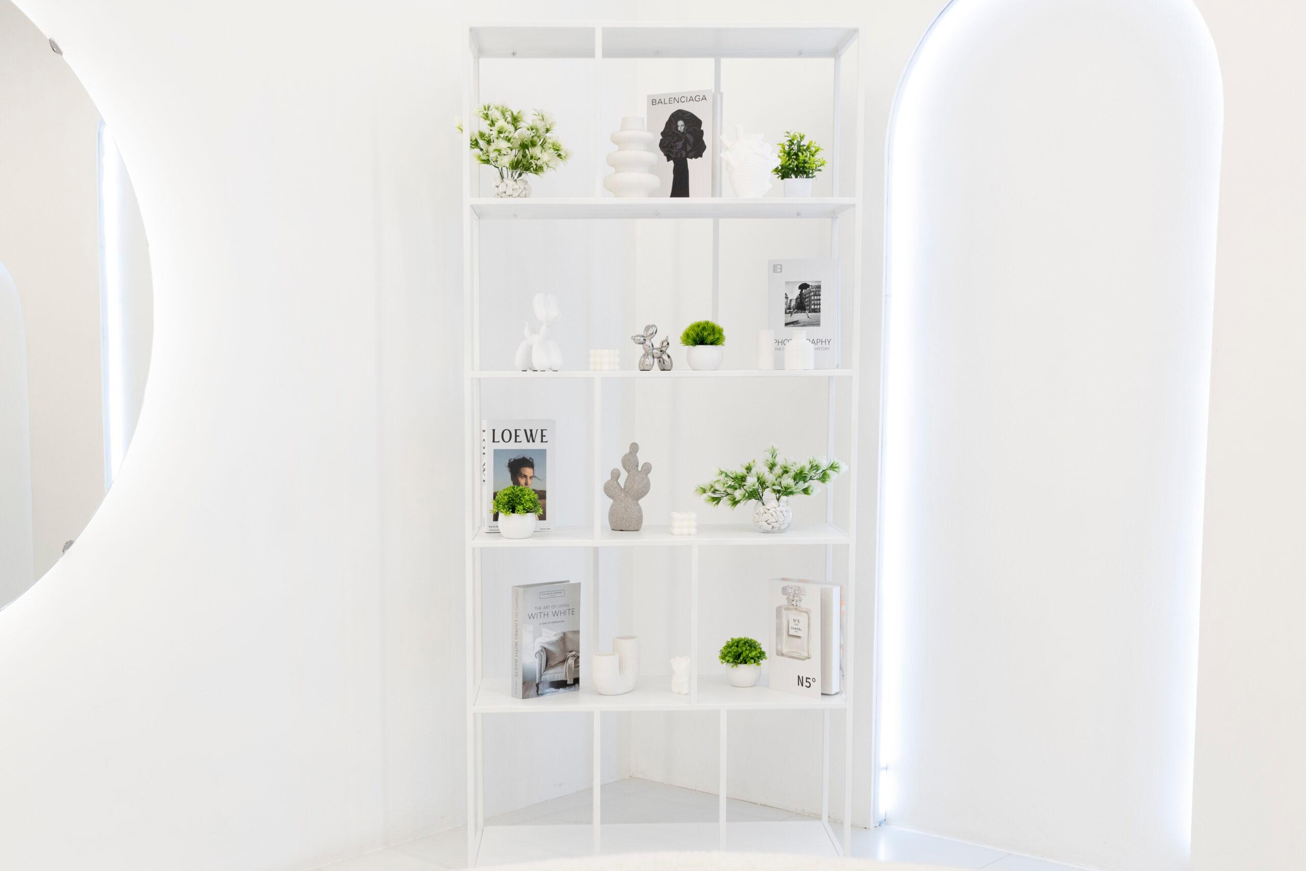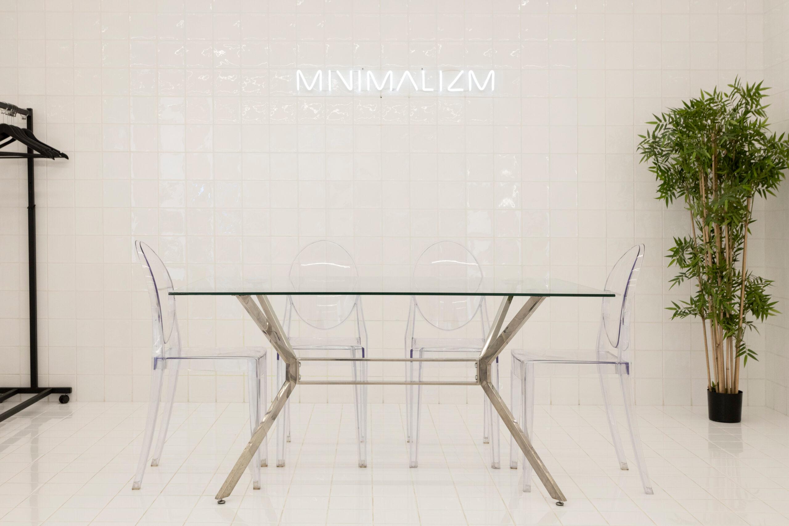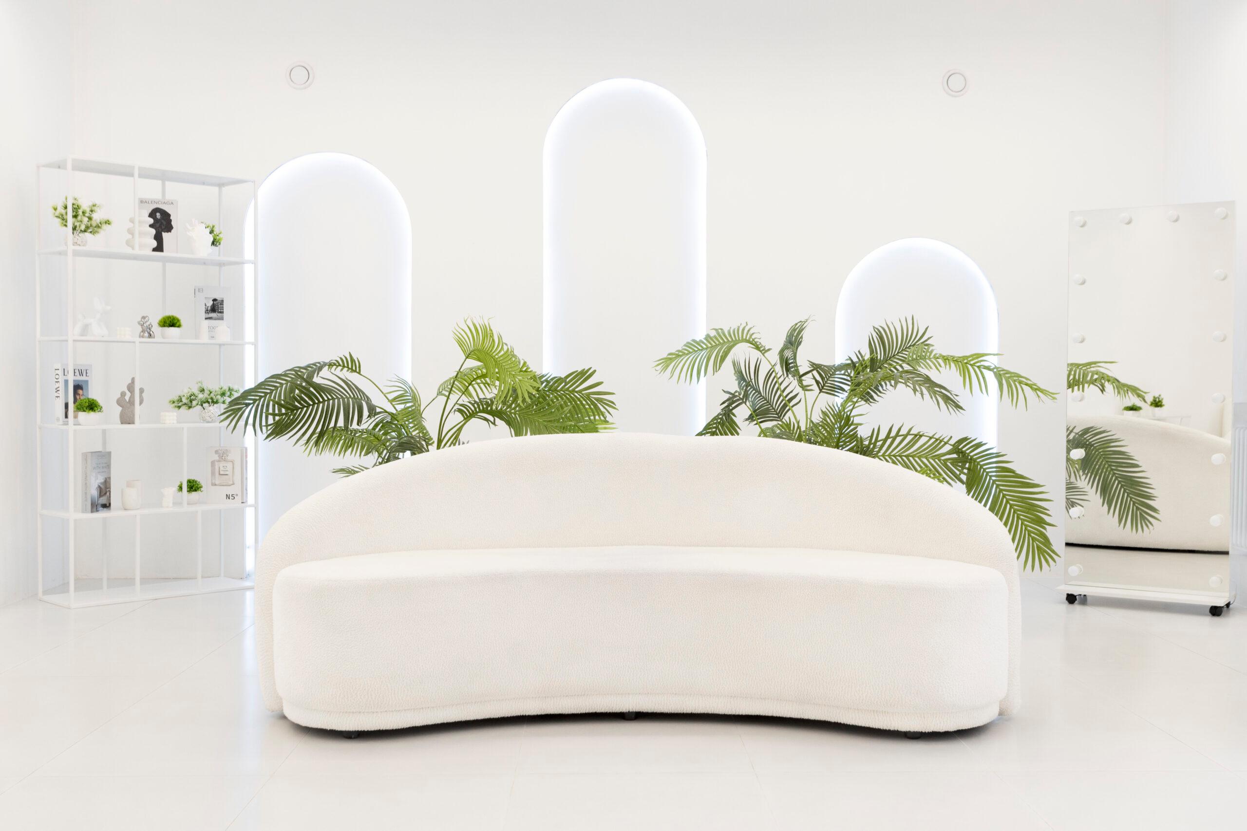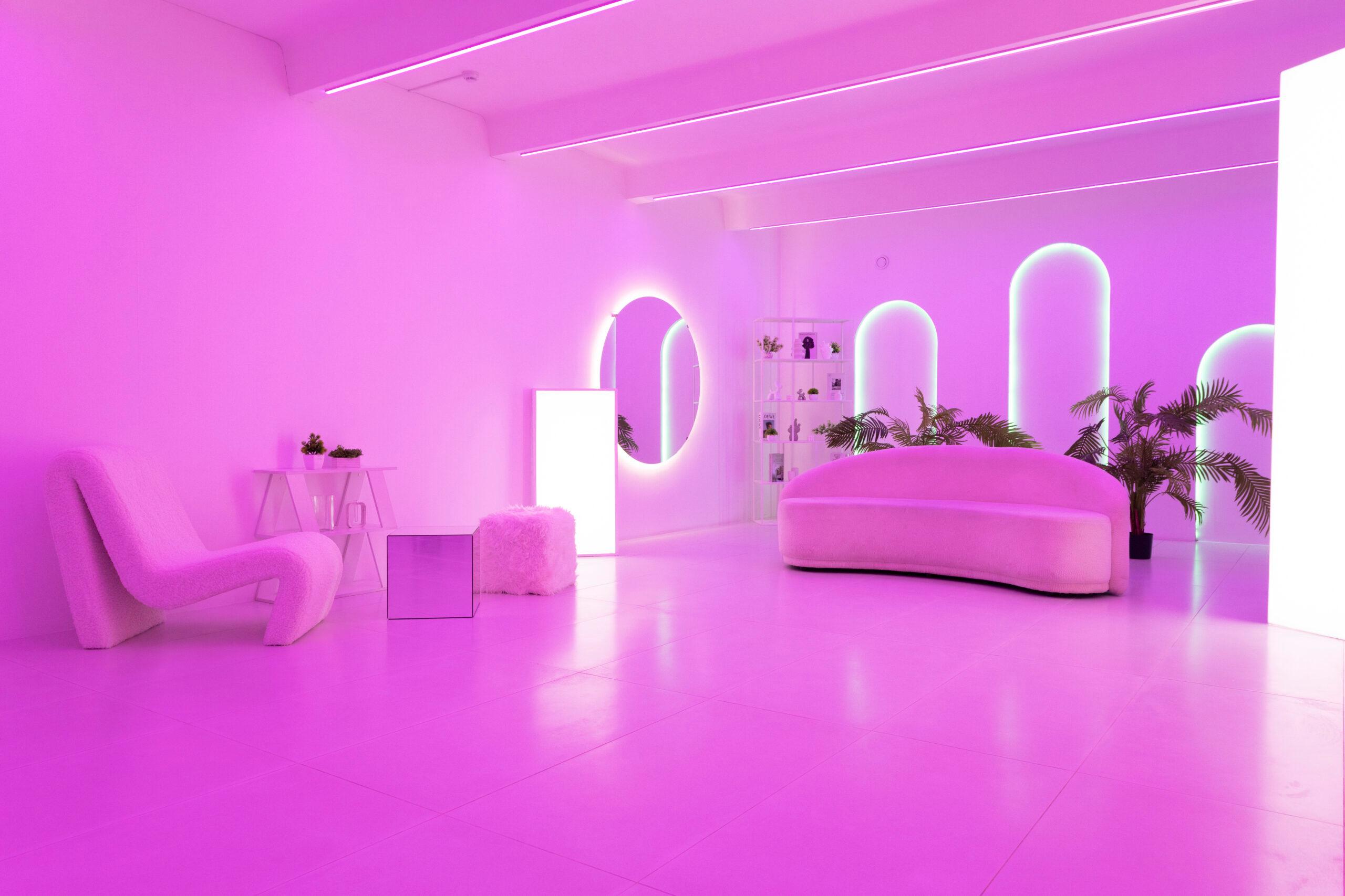 Белый зал с уникальным интерьерным решением. Встроенное светодиодное освещение позволяет изменить цветовую гамму по RGBW – каналам – CRI 91 и заполнить зал любым оттенком. В зоне с белой плиткой находится большой стеклянный стол, искусственные растения и неоновая вывеска с текстом MINIMALIZM. В основной части зала расположены белоснежный диван, стена с диммируемой подсветкой, а также пластиковые панели с подсветкой, и зеркало с внутренней светодиодной подсветкой.