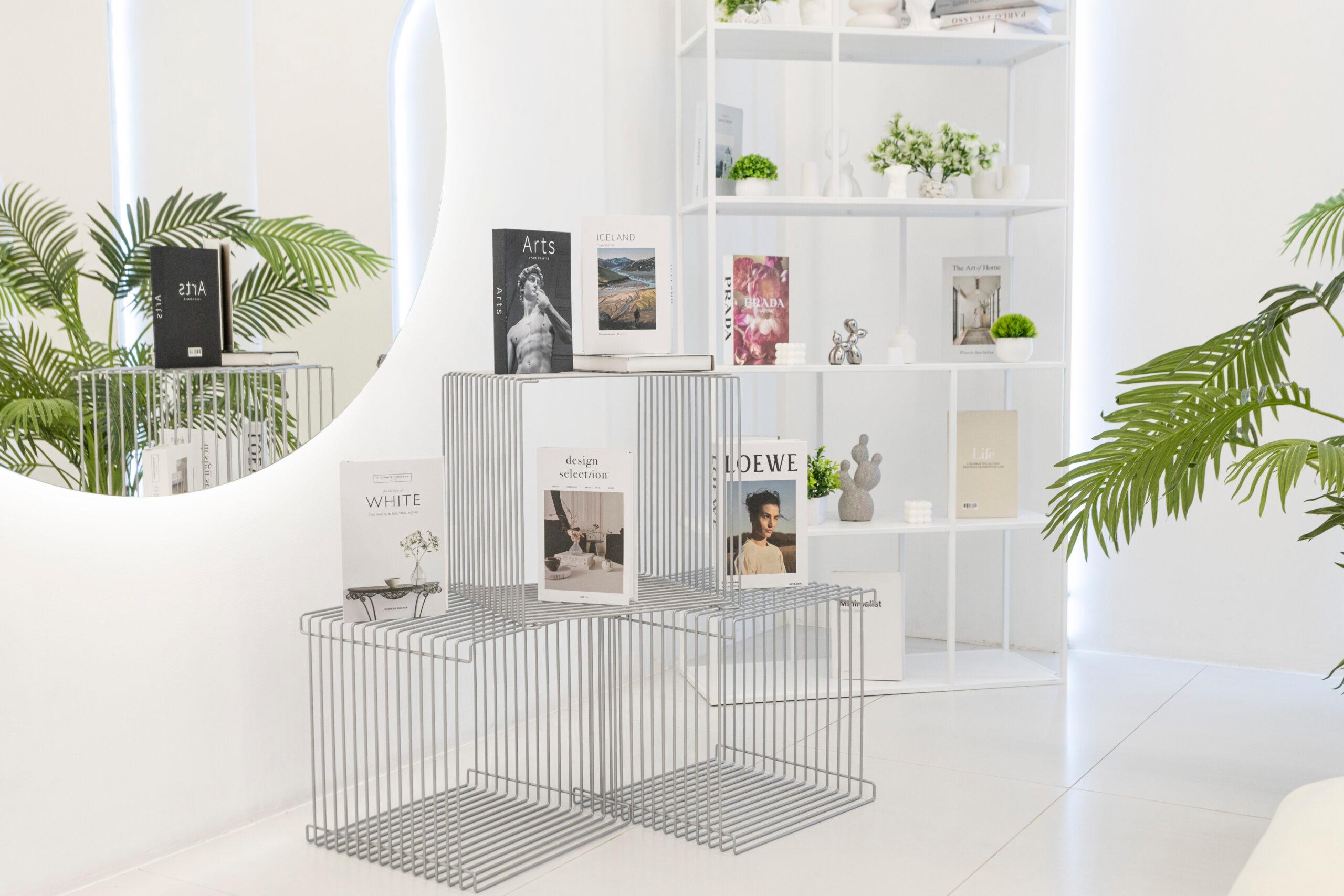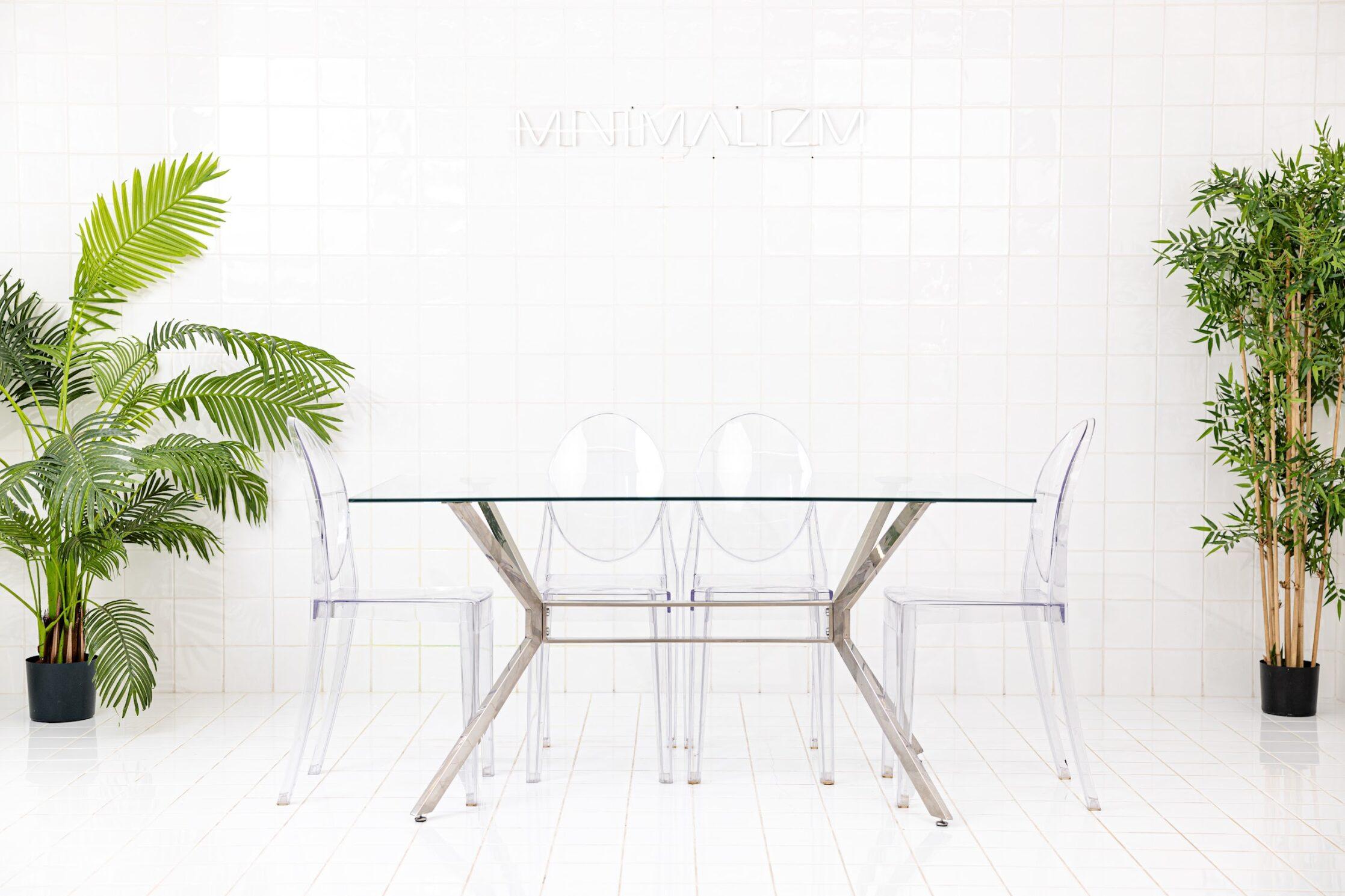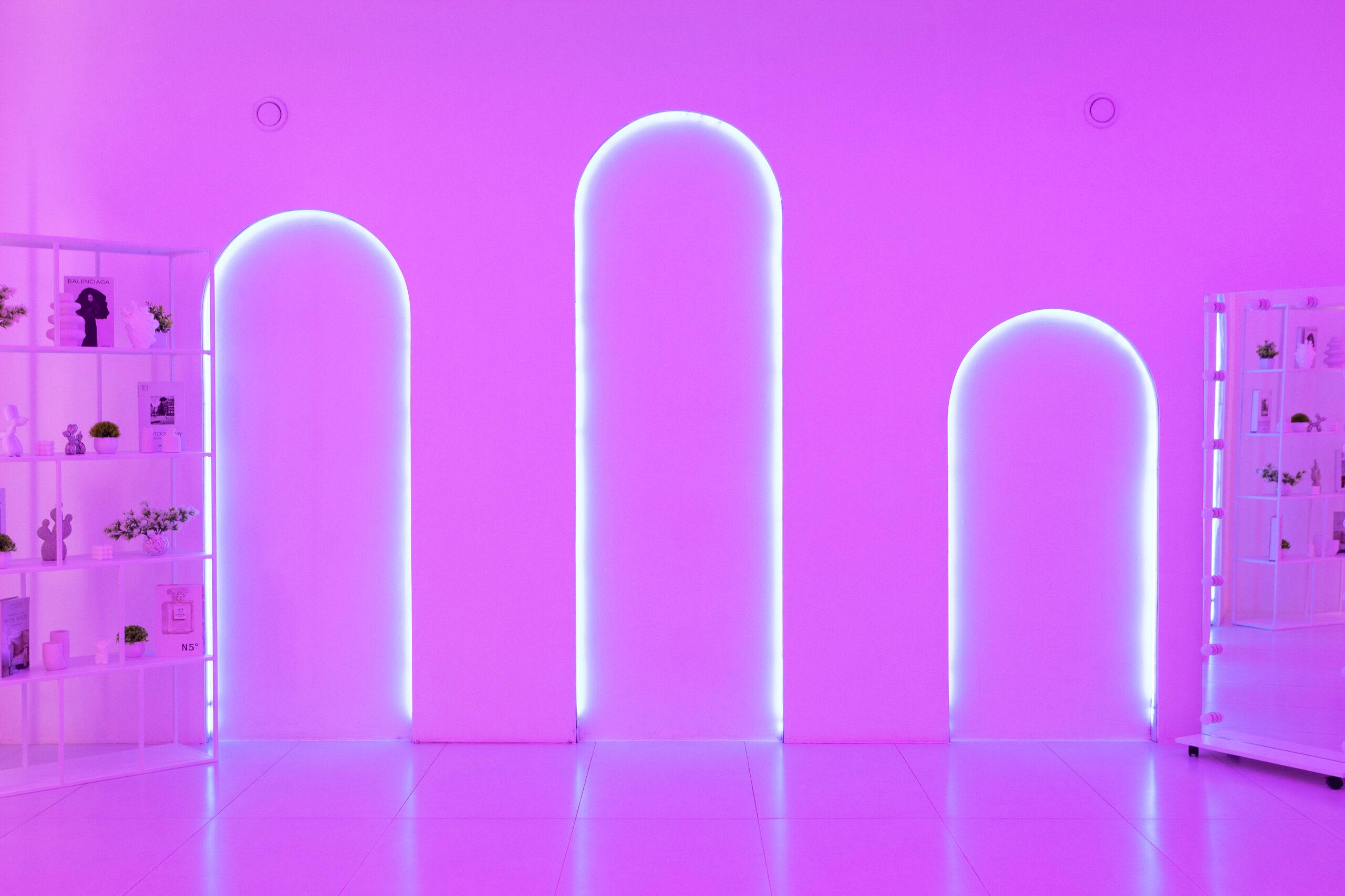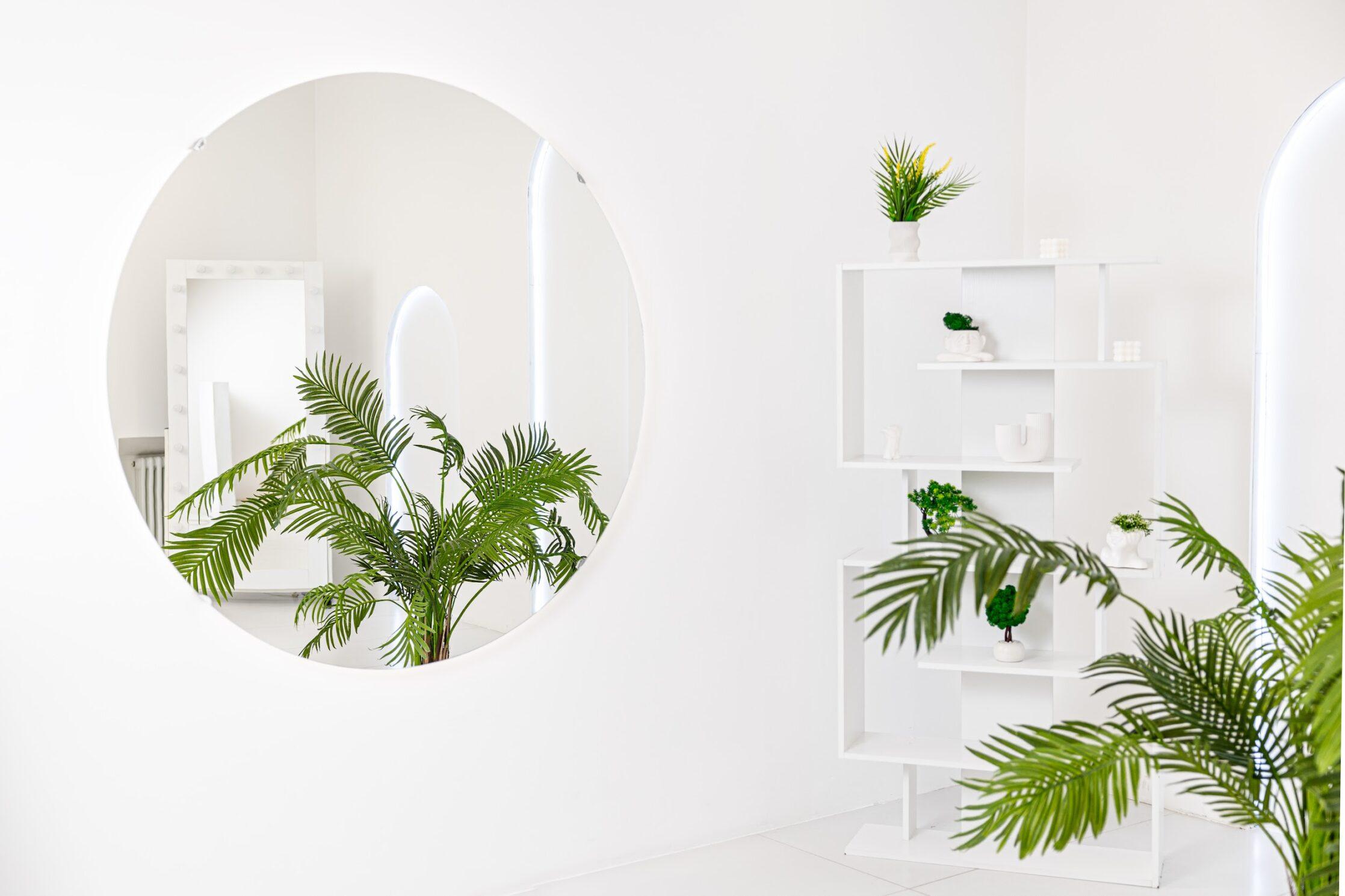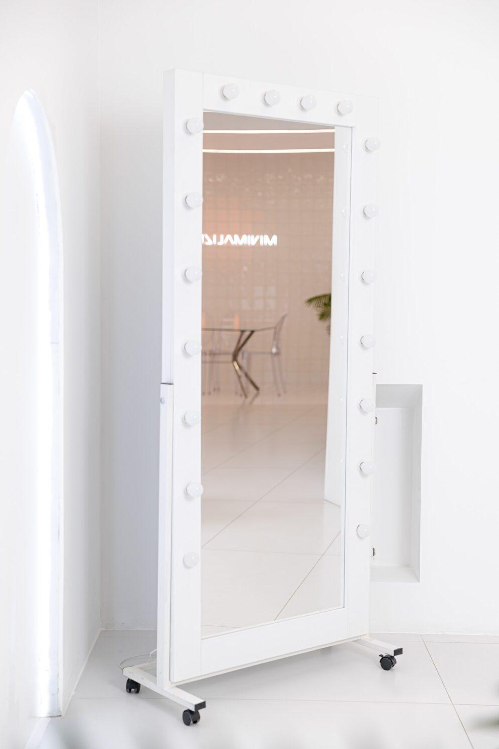 Белый зал с уникальным интерьерным решением. Встроенное светодиодное освещение позволяет изменить цветовую гамму по RGBW – каналам – CRI 91 и заполнить зал любым оттенком. В зоне с белой плиткой находится большой стеклянный стол, искусственные растения и неоновая вывеска с текстом MINIMALIZM. В основной части зала расположены белоснежный диван, стена с диммируемой подсветкой, а также пластиковые панели с подсветкой, и зеркало с внутренней светодиодной подсветкой.