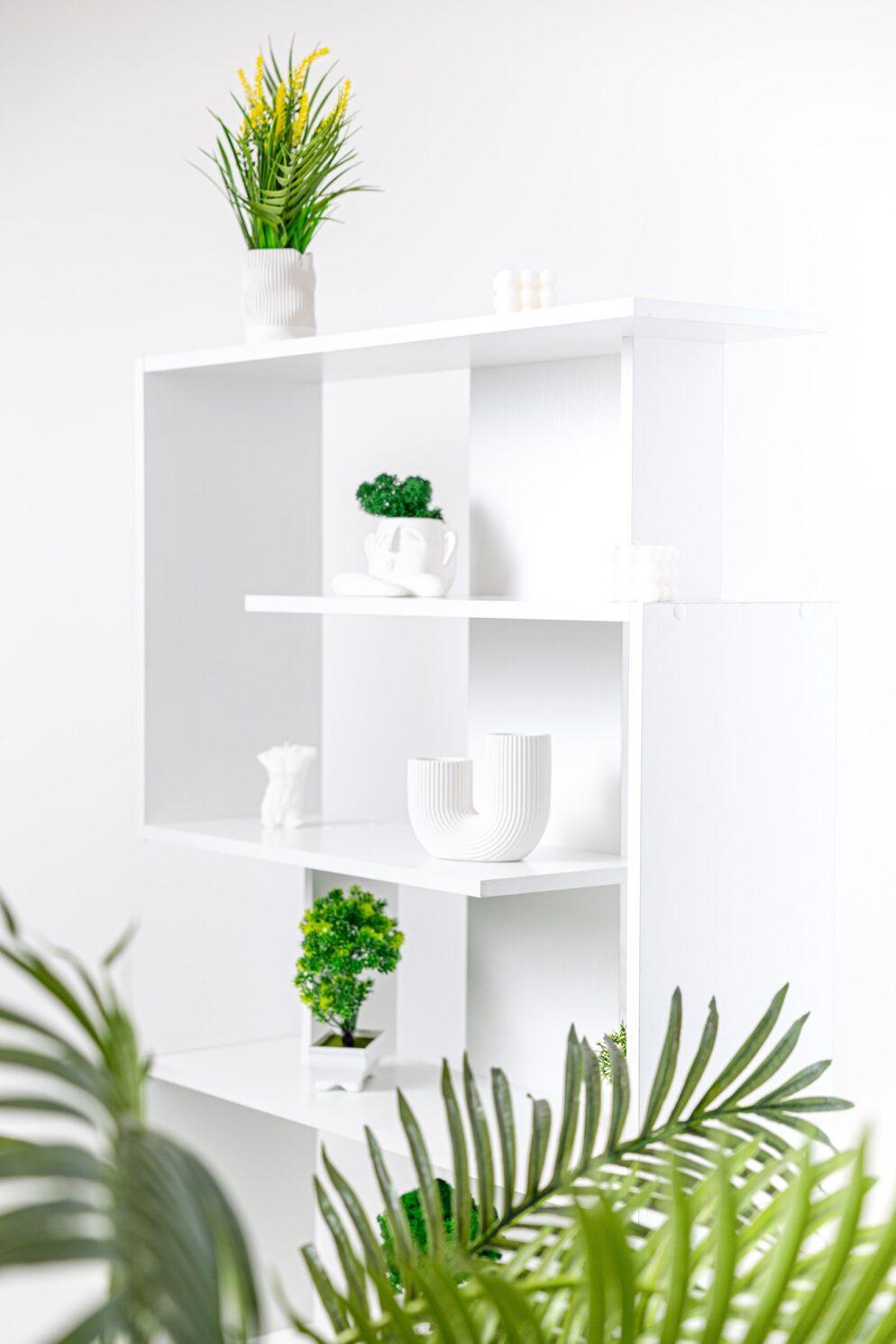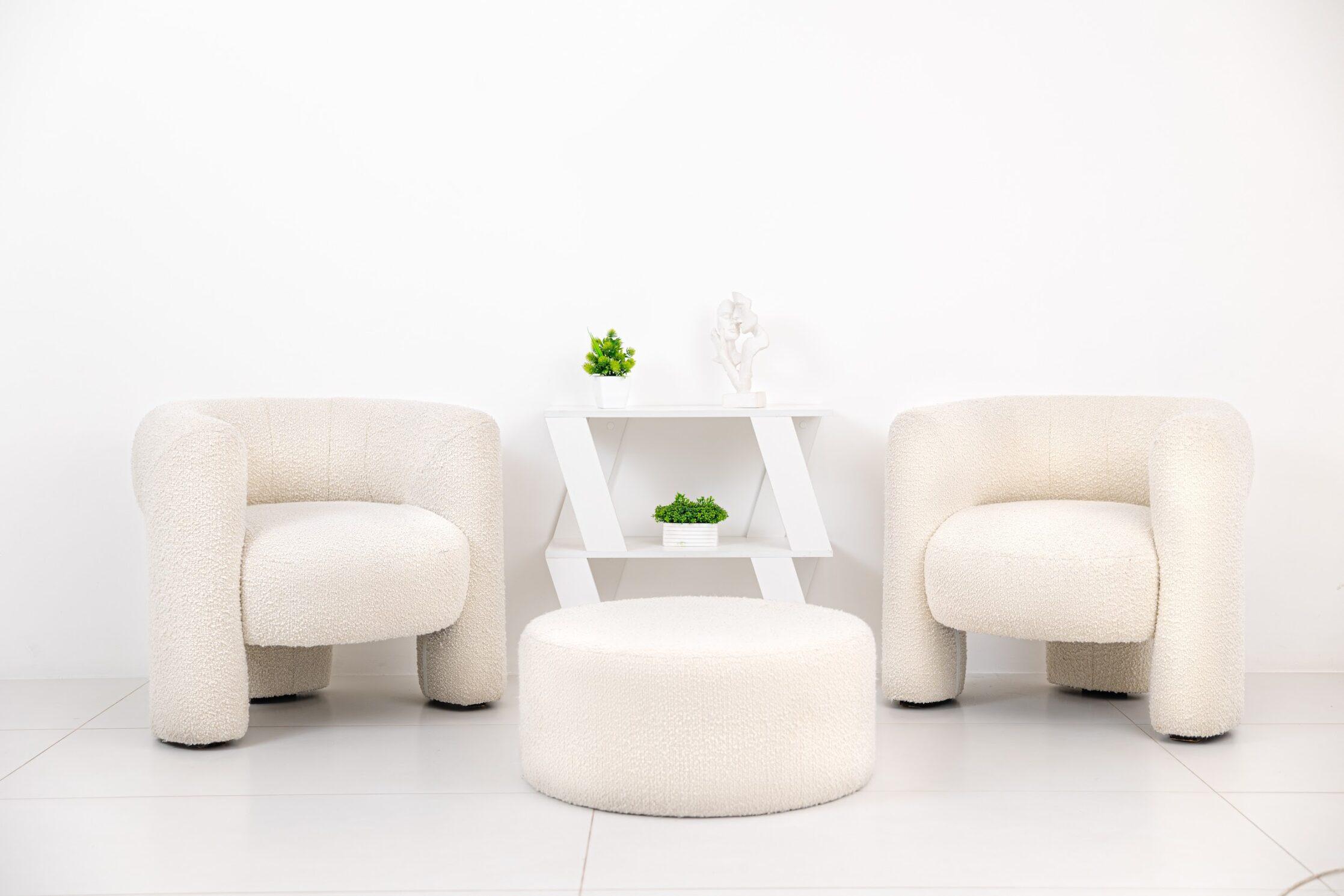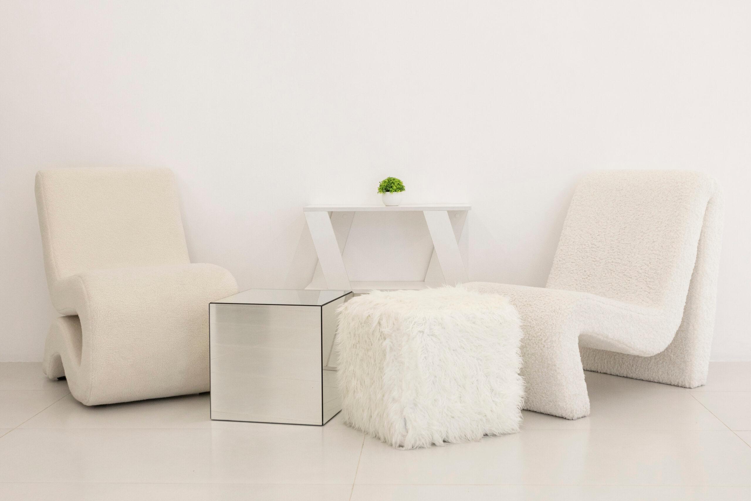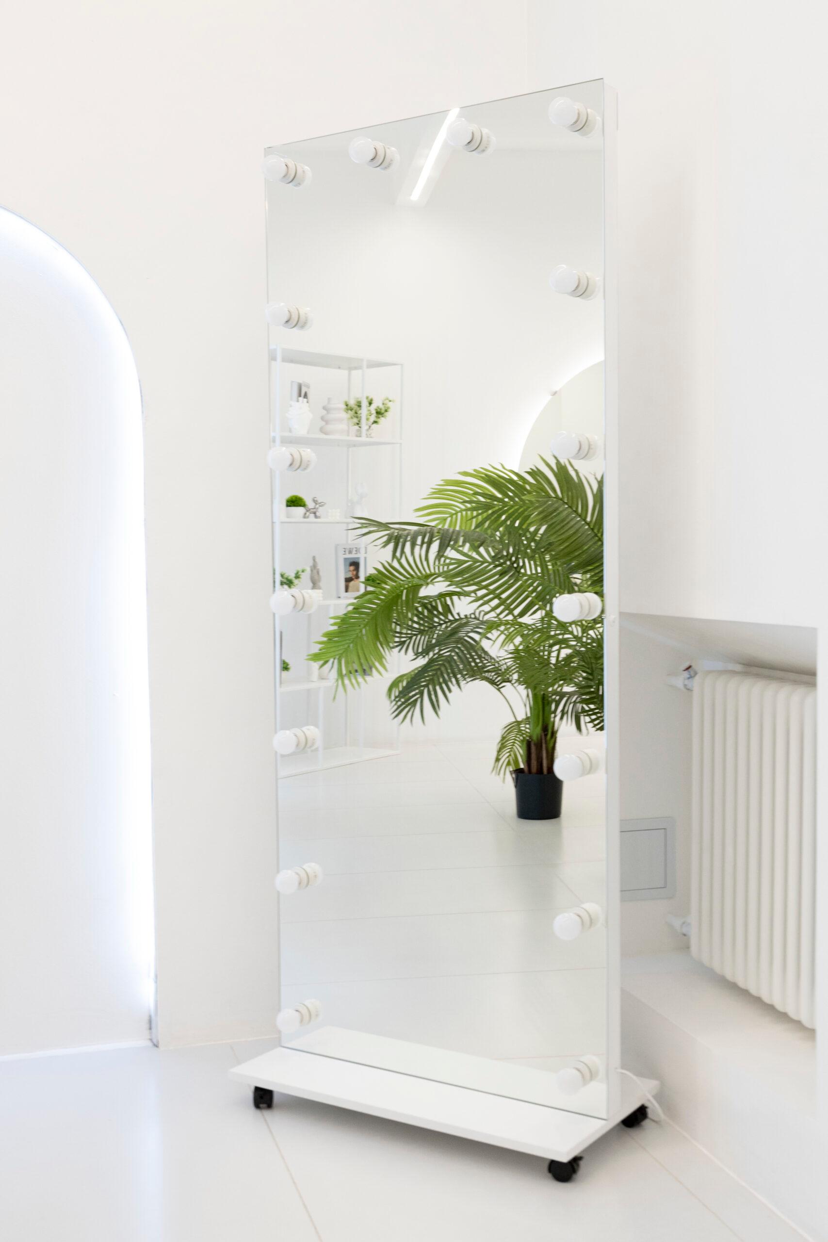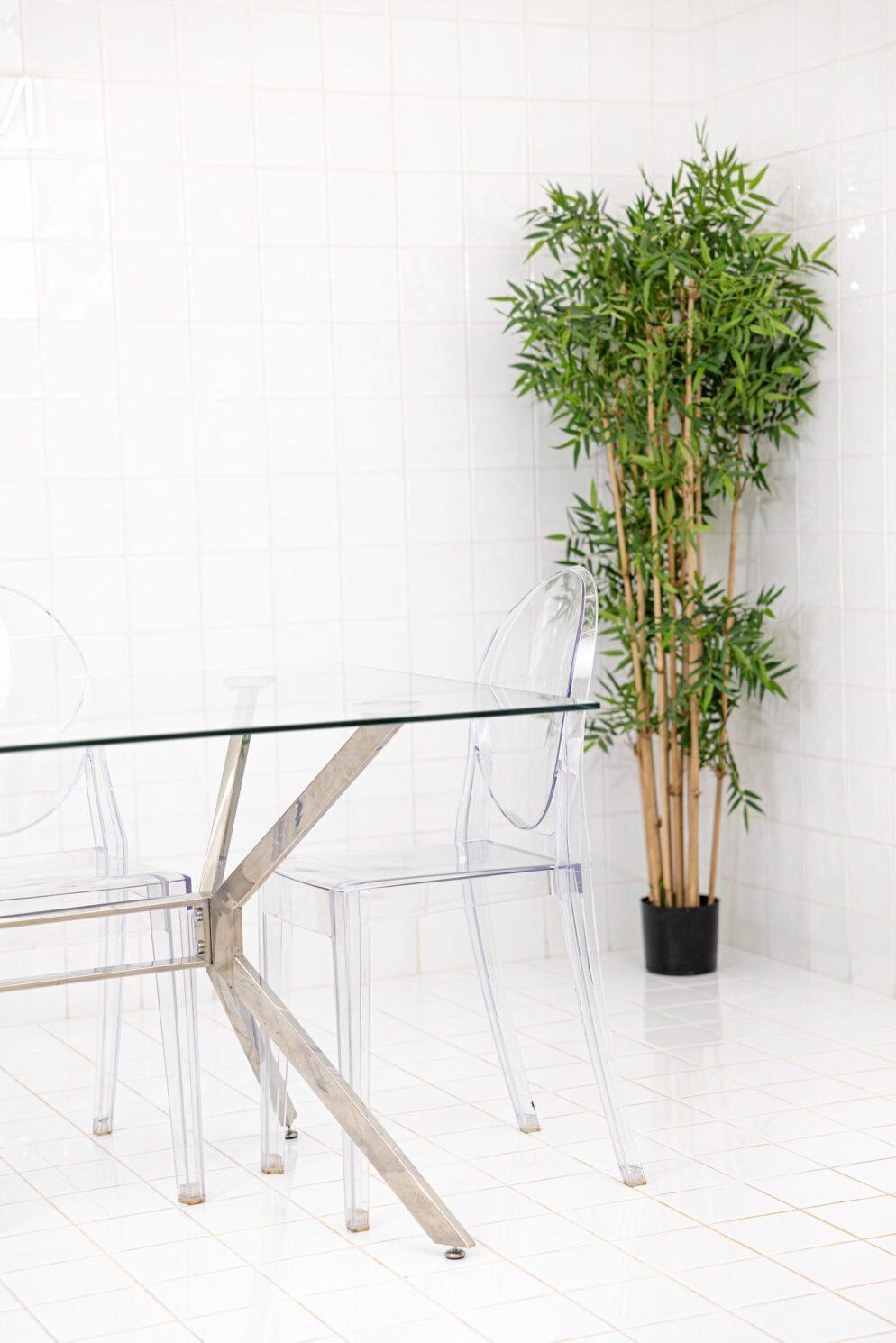 Белый зал с уникальным интерьерным решением. Встроенное светодиодное освещение позволяет изменить цветовую гамму по RGBW – каналам – CRI 91 и заполнить зал любым оттенком. В зоне с белой плиткой находится большой стеклянный стол, искусственные растения и неоновая вывеска с текстом MINIMALIZM. В основной части зала расположены белоснежный диван, стена с диммируемой подсветкой, а также пластиковые панели с подсветкой, и зеркало с внутренней светодиодной подсветкой.