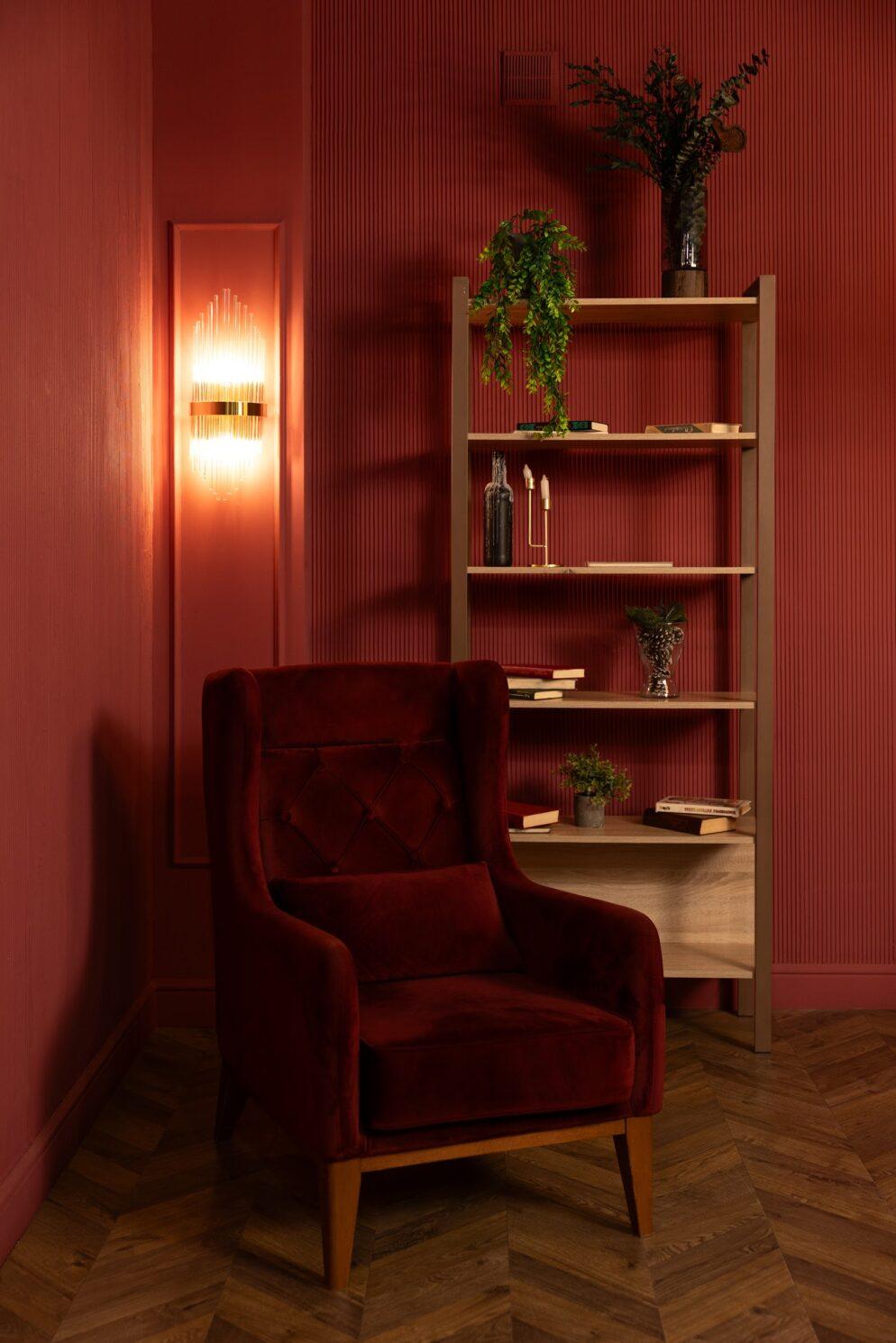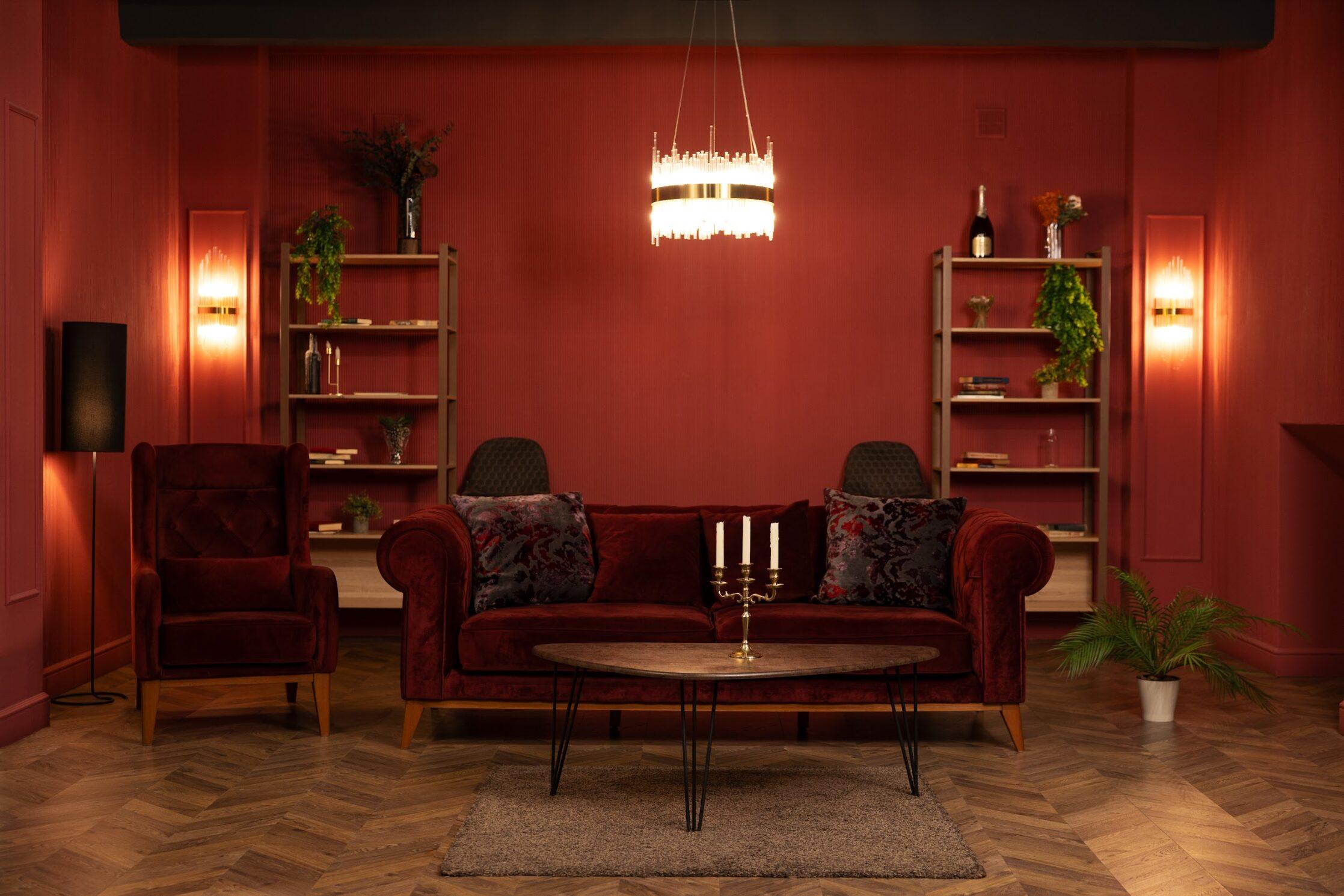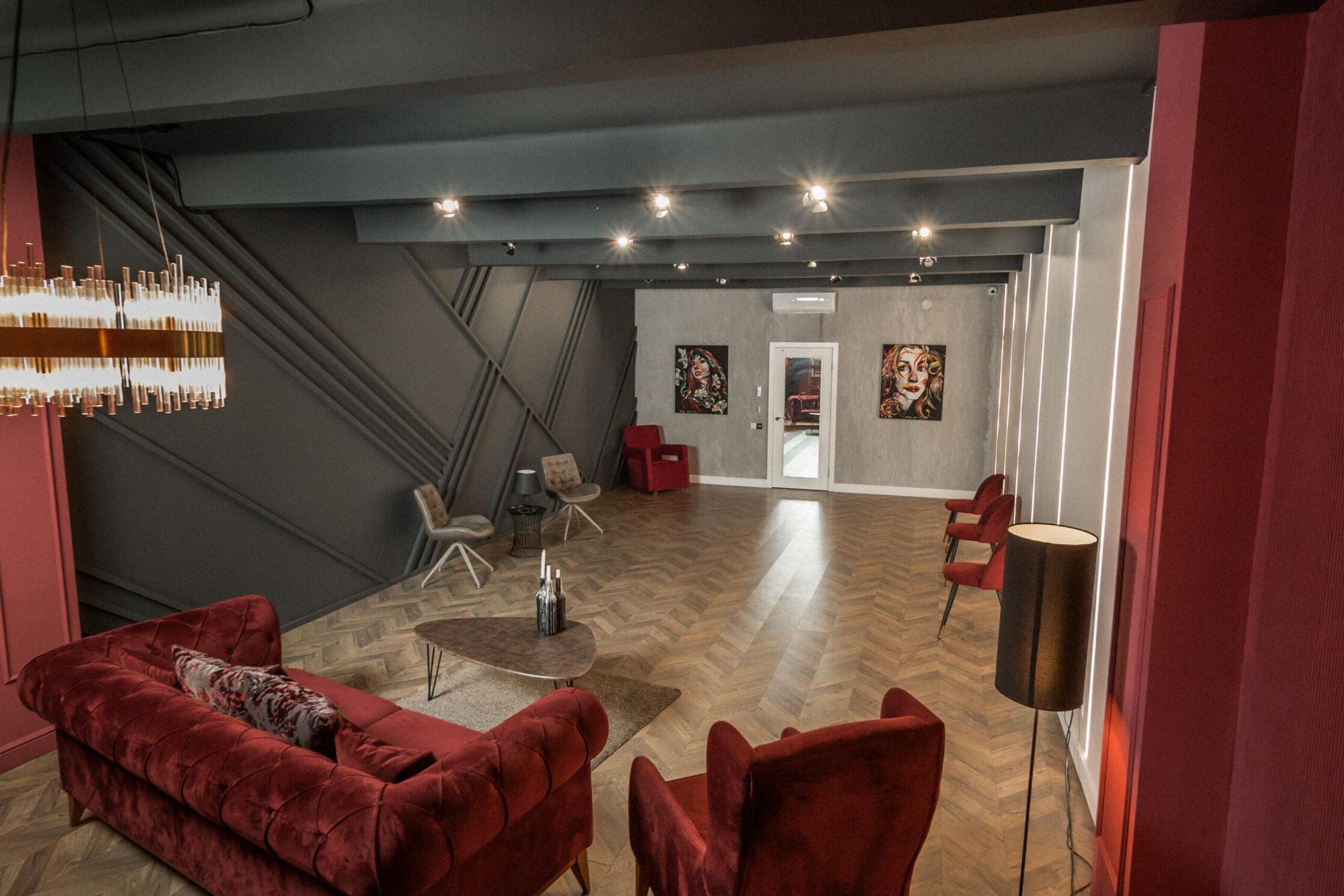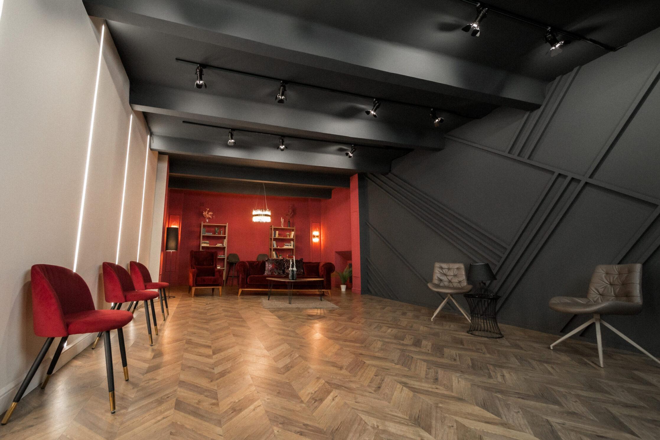 Элегантный темный зал с 3 уникальными зонами для съемки и грамотно продуманным интерьером. В зале находится дизайнерская мебель: широкий диван, кресла и несколько стульев бордового и темно-коричного цвета, а также два черных барных стула и массивный стол в темных тонах. Интерьерный зал Темный идеально подходит для съемок интервью, записи лекций и любых фото- видеосъемок.